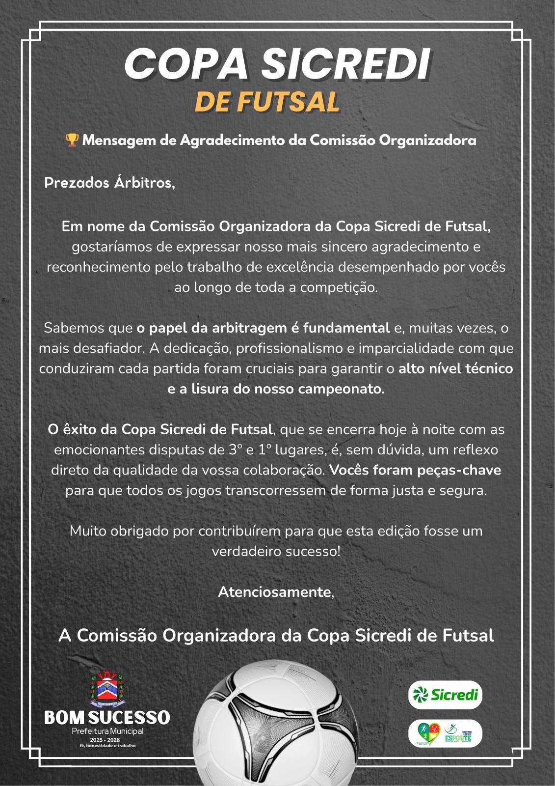 Aos Atletas: Pela garra, drible e espírito esportivo que nos inspirou. Vocês são a verdadeira força do Futsal! Aos Árbitros: Pelo profissionalismo e imparcialidade que garantiram a lisura do torneio.